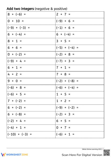 You can do the exercises online or download the worksheet as pdf. Web here are the rules for adding or subtracting negative numbers: This integers worksheet may be configured for either 1 or 2 digit horizontal addition problems with 2 terms.